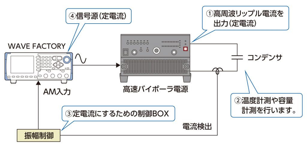 - 電解コンデンサ、フィルムコンデンサの高周波リップル試験用電源