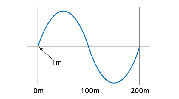 1MHzで考えると、その波長は空気中で300m、同軸ケーブル内では約200mです。通常使われる1m程度の同軸ケーブルでは、十分無視できると考えられる範囲です。(図H)