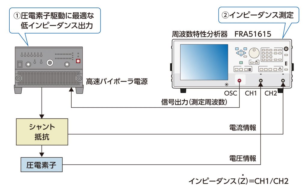 圧電体は駆動条件(電圧・周波数)によって動作が変化します。したがって、実際の駆動状態と同じ電圧で駆動できる電源を用いて評価することが重要です。そのためには、電源の出力電圧を十分にとれることはもちろん、圧電体駆動に強い完全4象限動作であること、低インピーダンスであることがポイントとなります。