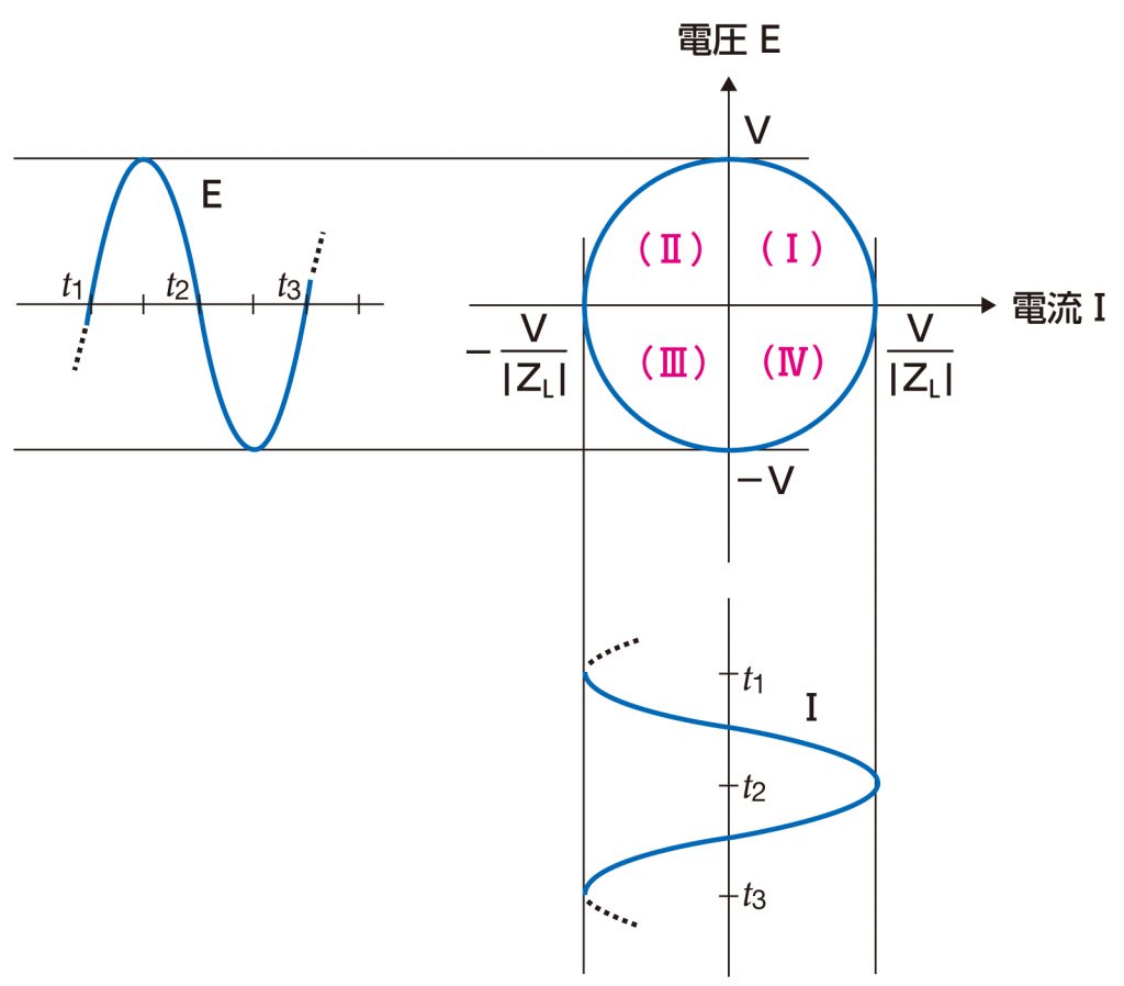 抵抗(R)負荷の時に直線になる負荷線は、インダクタ(L)負荷では、図2のような円形になります。